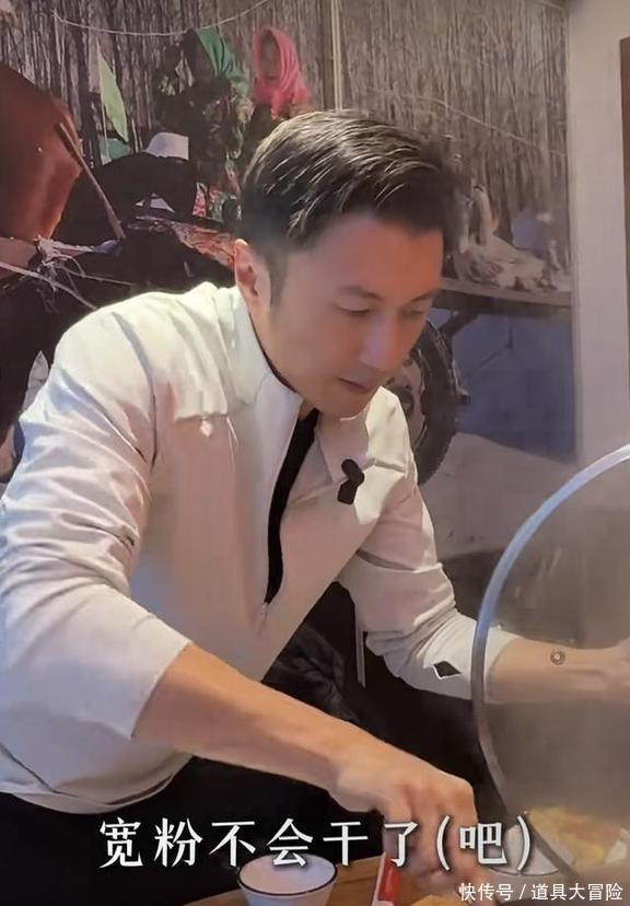 服务员把大鹅和配菜放进锅里,加了点调味料后,就把锅盖盖上等着了。谢霆锋那个心里不安,隔三差五就掀开锅盖瞅一眼,生怕锅里的宽粉糊了。他心里大概是想着别让东西粘到锅底之类的吧。