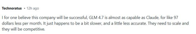 也有现实中使用GLM大模型的网友充分表达了对智谱的认可。一位叫Technoratus的网友说:“就我个人而言,我相信这家公司会成功。GLM-4.7的能力几乎与Claude相当,每月费用却低了97美元。它只是在响应速度上稍慢一些,准确性也略逊一筹。只要他们实现规模化发展,就会具备竞争力。”
